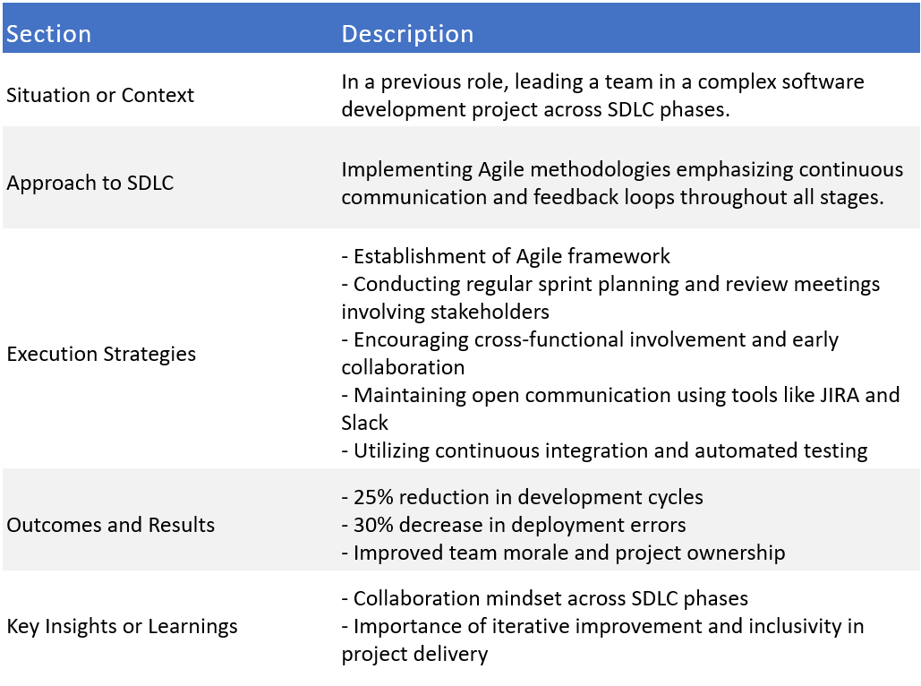 My strategy centered on fostering seamless collaboration by implementing Agile methodologies, emphasizing continuous communication and feedback loops across all SDLC stages.