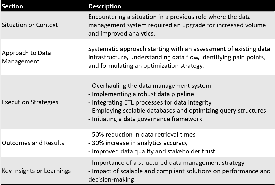 The revamped system resulted in a 50% reduction in data retrieval times and a 30% increase in analytics accuracy. Moreover, our adherence to data governance led to improved data quality and increased trust among stakeholders.