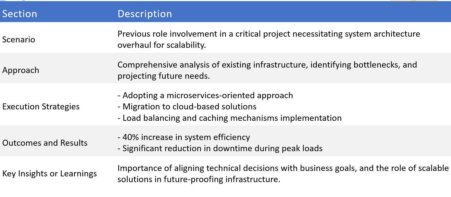 This experience taught me the significance of aligning technical decisions with overarching business goals. By integrating scalable solutions, we not only met immediate needs but also future-proofed our infrastructure, ensuring it could adapt to the dynamic market landscape.